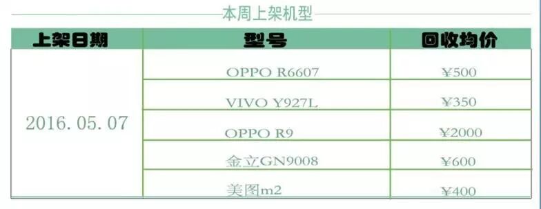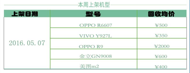 估吗一周回收机型上下架分析:本周上架机型主要为OPPO系列,包括新上市的OPPO R9,回收均价约2000元左右以及颇受自拍妹子喜欢的美图 m2回收均价约400元左右。(估计手机最贵的就是摄像头了)不得不提的是金立 GN9008也在新上架回收机型,居然还可以换600大洋。家里有的小伙伴们赶紧来回收吧!