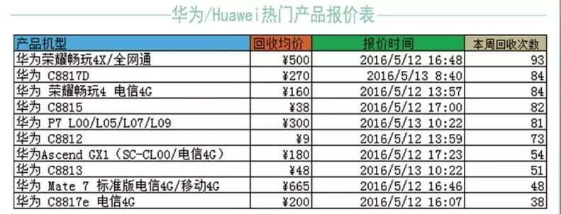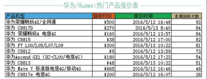 本周热门回收机型是华为系列,其中华为荣耀畅玩4x/全网通回收数量是最多的,一周居然有93次,当周回收均价约500元。整体回收数量上较上周三星系列比多了近一倍左右的回收次数。看来还是有很多朋友们喜欢国产品牌。