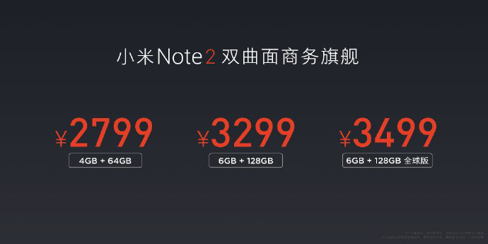 版本/售价简述:小米Note 2有三个版本,其中4+64GB售价2799元;6+128GB售价3299元;6+128GB(全球版)售价3499元。拥有冰川银、亮黑两种配色。(*全球版支持6模37频,其他版本支持6模19频)