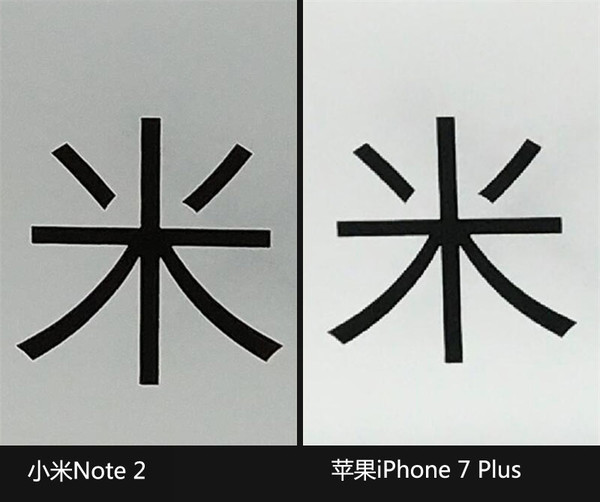 另一方面,小米Note 2的后置摄像头达到2256万像素,在细节表现上面,相对于1200万像素的iPhone 7 Plus更有优势,可以看到后者的“米”字边缘已经出现了锯齿感。