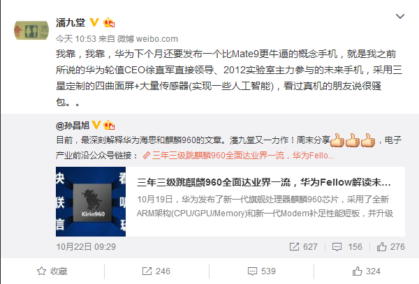 【PConline 资讯】前不久,小米发布的概念机MIX,其高达91.3%的屏占比,让科技界纷纷称赞其是真正的黑科技,这也证明了小米公司在创新和研发方面的努力。事实上,除了小米之外,也有其他的厂商在研发概念产品,知名业界分析师潘九堂爆料,华为将在12月发布一款概念手机,该机比刚刚发布的华为Mate 9旗舰手机还要强悍。
