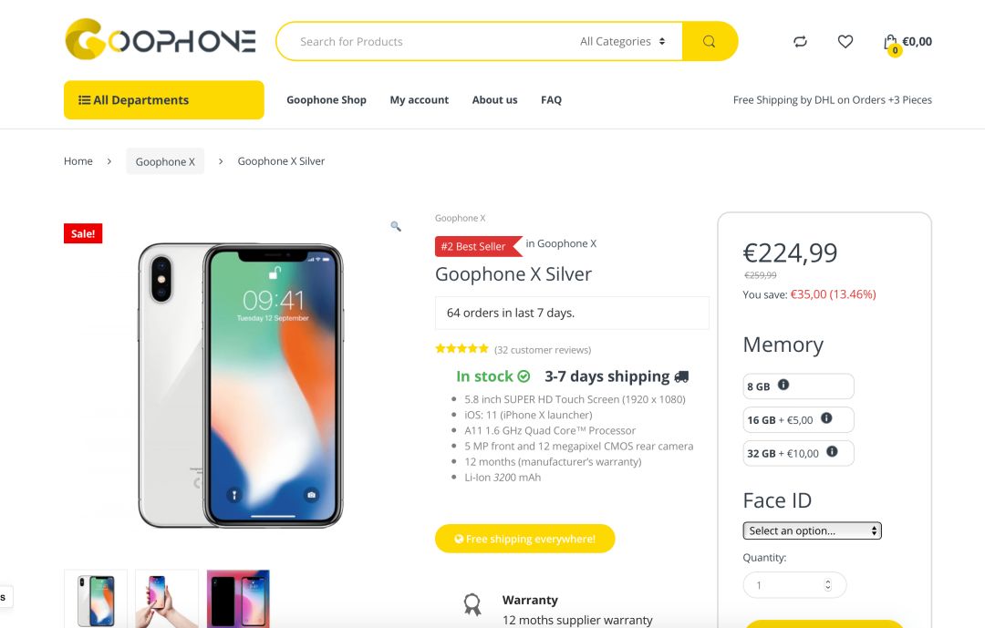 GOOPHONE X 官网上,该款手机售价只需??224.99(约1767元人民币)。