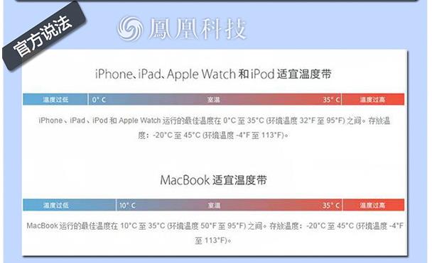 以苹果为例,其官方建议操作环境在0°C 至 35°C为宜。而在低于0°C的情况下,手机显示电量会降低,有风险进入自动冻结状态,也就是自动关机。同样的,如果温度超过35°C,手机也会有电池过热报警,同时自动关机。以下是iphone官方给出的说法。