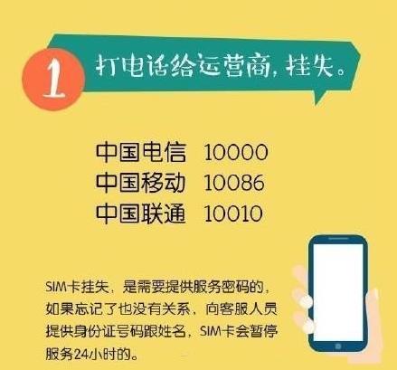 Step1:打电话给运营商,挂失!SIM卡挂失,是需要提供密码的,如果忘记密码,也可向客服人员提供身份证号码跟姓名,SIM卡会暂停服务24小时