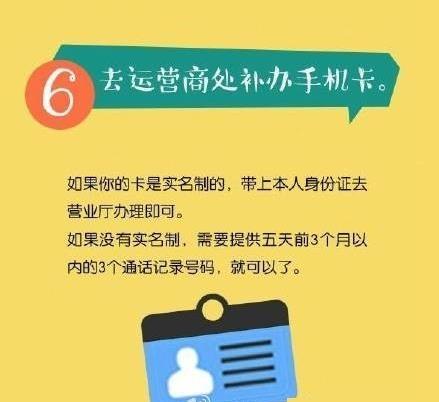 Step6:去运营商处补办手机卡,如果你的卡是实名制的,带上本人身份证去营业厅办理即可,如果没有实名制,需要提供五天前3个月以内的3个通话记录号码即可